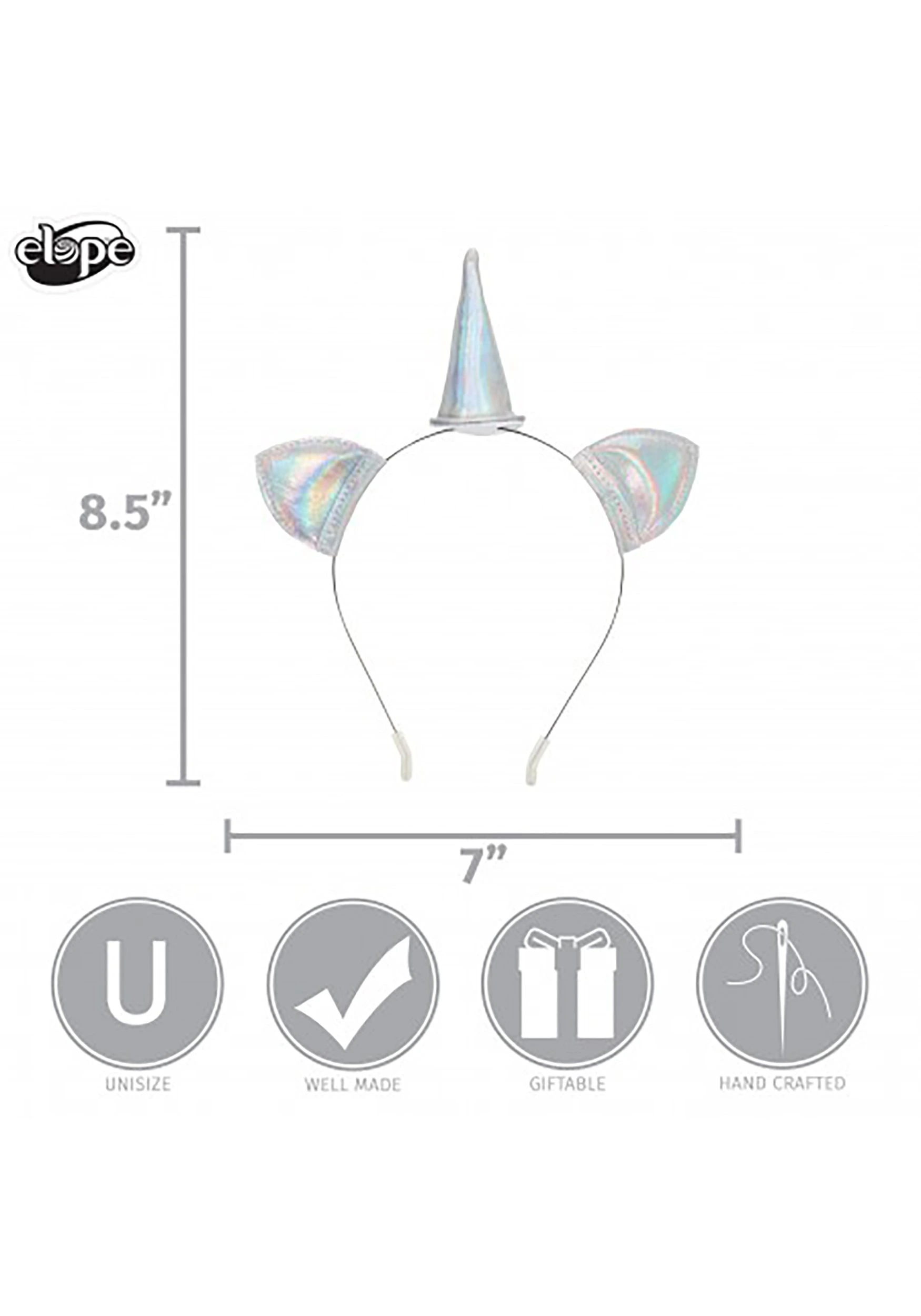 - Iridescent silver ears & stuffed conical horn attached to narrow metal headband