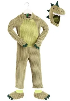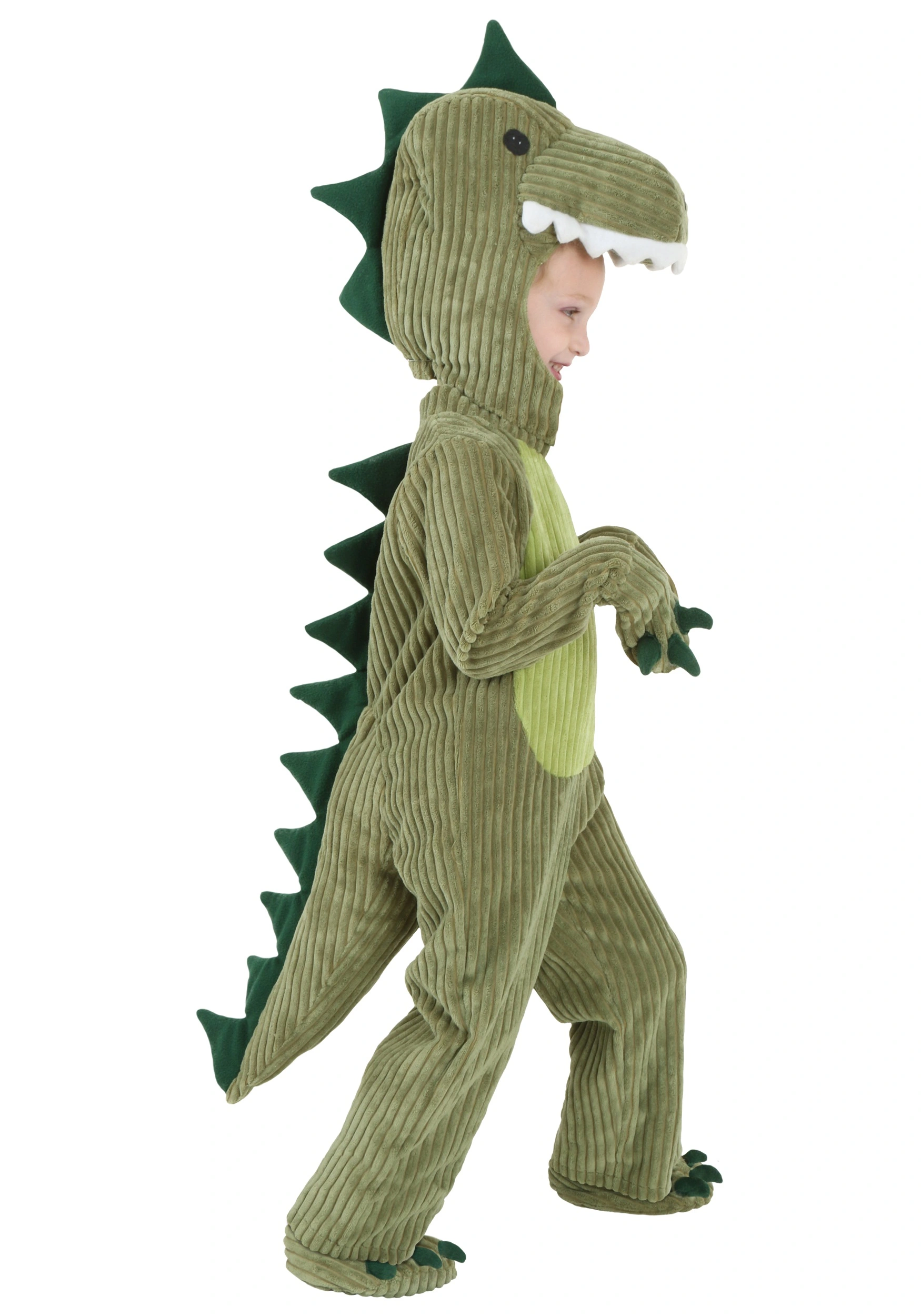 Well, it’s not exactly like real-life dinosaur skin. But it does have a real texture on its real fabric, and it’s designed to be worn by your real live child, not a soulless digital model like they’d probably use in the movies nowadays. We thought about making it out of latex so we could get that bumpy-scaly look just right, but we didn’t think anyone would want a costume that weighed as much as an actual tyrannosaurus. So we made it out of cozy corduroy and fleece instead, with lightweight polyfoam padding for support!