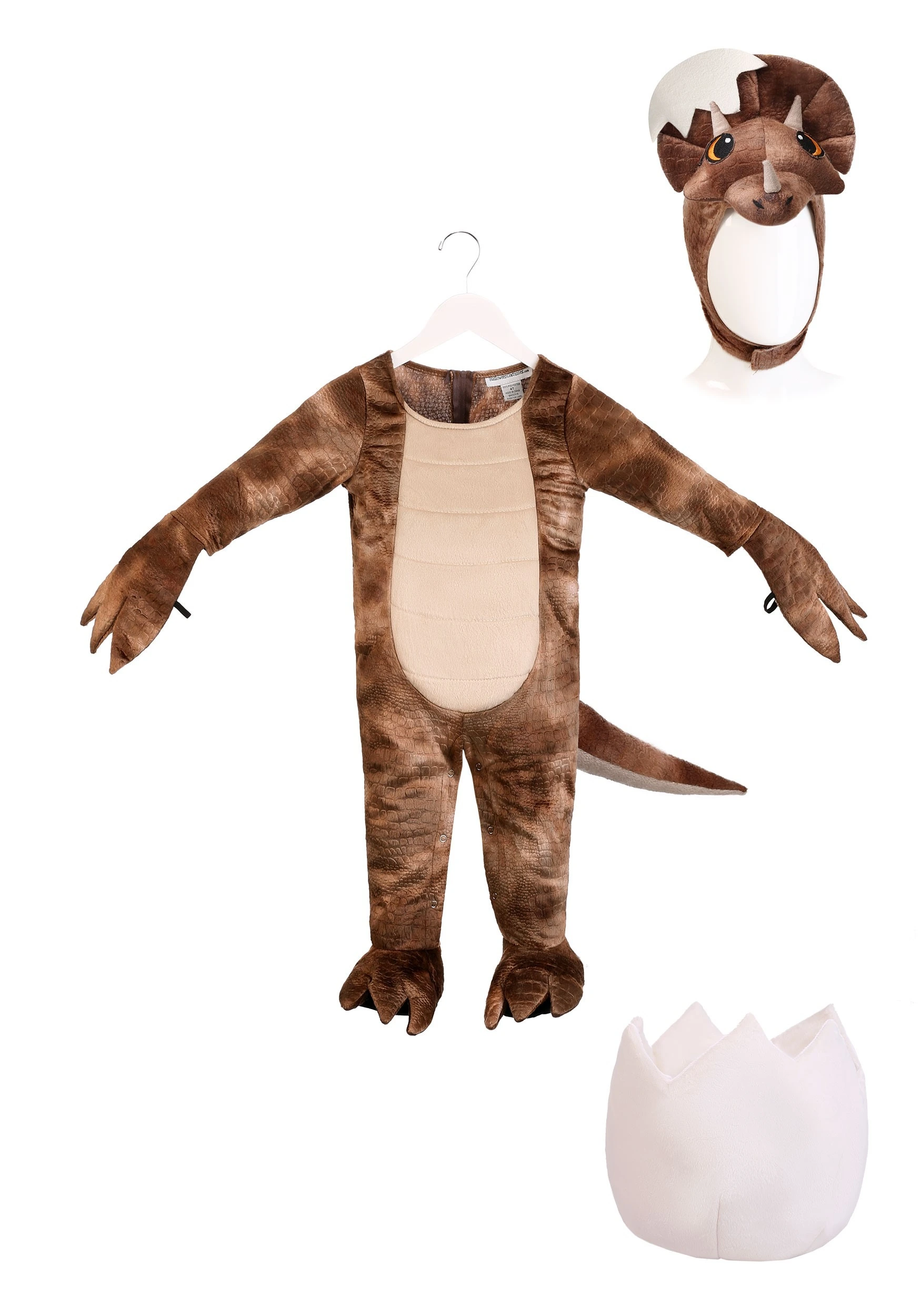 Our costume designer worked hard to make this Toddler Tiny Triceratops Costume the epitome of cuteness. It comes with a soft, velour jumpsuit that fits with a zipper in the back, making it easy to get your little one all dressed up in an instant. The back of the jumpsuit has an attached plush tail. The headpiece is shaped like a dinosaur face and it even has a little eggshell piece on the top of it. Finally, A foam eggshell piece attaches to the bottom of the costume, making it look like your little one just hatched!