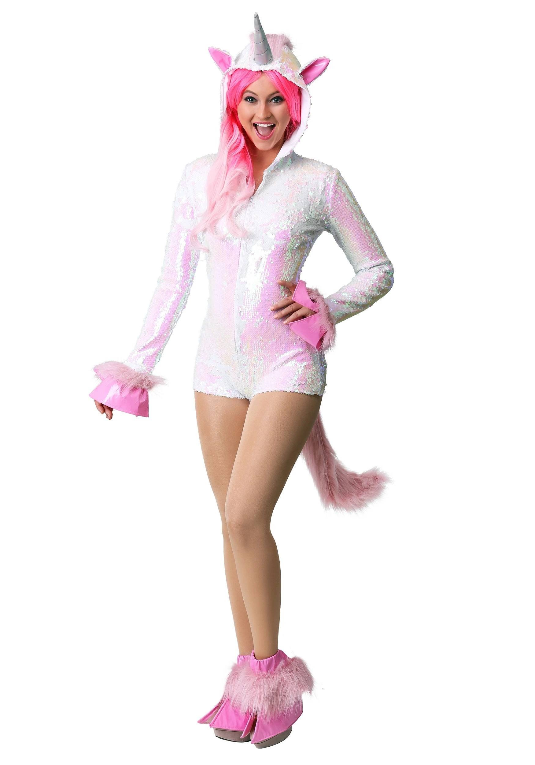 Okay, gotcha. You might not actually be a member of the unicorn species, but that’s sure no reason not to dress up as one this Halloween. This fantastic unicorn costume will be just the thing for your transformation! designed as a short cut romper with long sleeves, it’s fully finished in pink and silver sequins, and it’s got even more unicorn style packed into it’s design. That’s cause it’s got a faux fur tail, pink “hoof” like cuffs with more accent fur, and naturally, ears and a soft sculpted horn on the hood. It even comes with foot covers to complete your wild appearance!