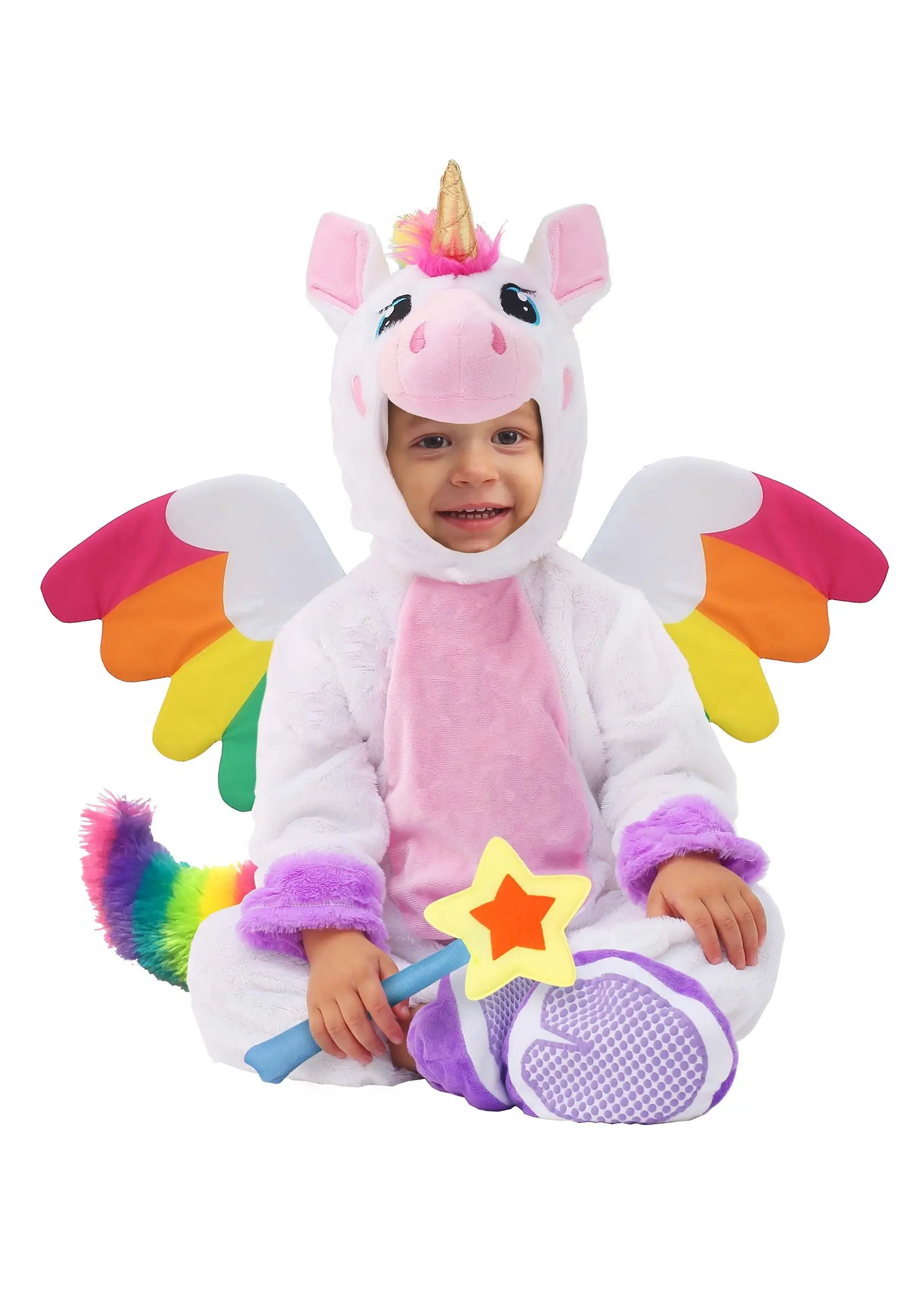 Your little one will shine in this sweet Rainbow Unicorn Costume for Toddlers! The one-piece outfit is made of snug white and pink fleece fabric. It fastens at the back and the smaller sizes have snaps along the crotch and inseam for easy diaper access. Purple fleece trims the wrists and tops the foot covers. A rainbow tail is sewn to the jumpsuit’s seat. A pair of rainbow wings attach to the back of the jumpsuit and the hood pulls up to reveal unicorn features, ears, and a golden horn. There’s even a star-shaped wand for your unicorn to hold!