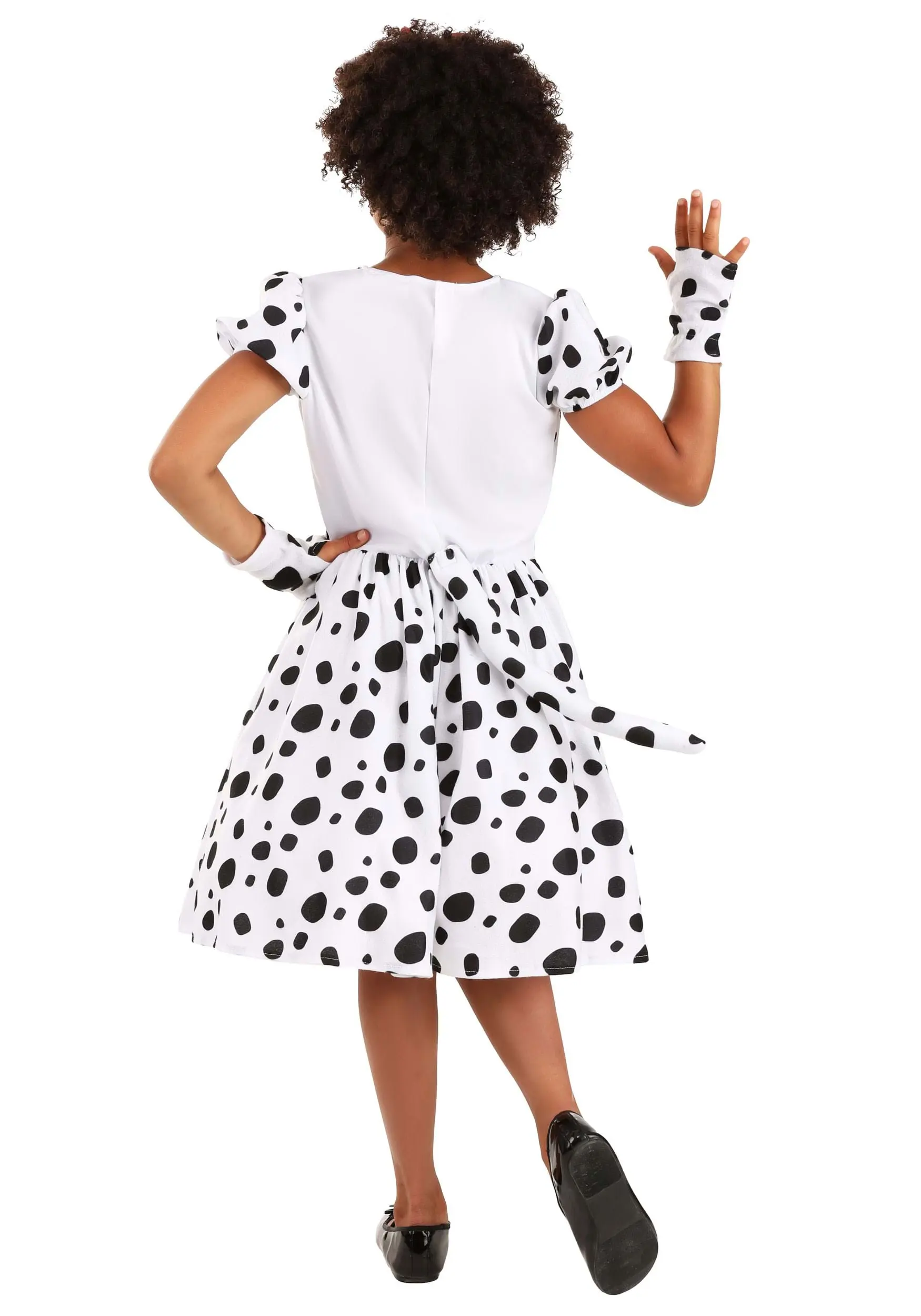 You’re sure to have a doggone-good time at your next costume party in this exclusive Kid’s Dalmatian Dress Costume! The adorable white dress is 100 percent polyester velour fabric and covered in cute black spots, just like your favorite Dalmatian! The dress features short, puffy sleeves and a black satin ribbon bow at the front of the waist. The neckline is edged with a glittery red ribbon that has an appliqued “dog tag” hanging from it. To make this costume easy to wear, there’s a hook-and-loop fastener at the back of the neck, along with elastic in the sleeve cuffs and at the back of the waistband. Best of all, the dress comes with a stuffed tail that attaches to the back! The costume also includes a satin-covered plastic headband with bows of Dalmatian-print velour and red satin, as well as two white fingerless gloves that each have a black paw print on the underside!