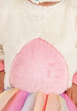 Be there for every magical twirl as your peanut prances around in this Posh Peanut Toddler Eleanor Unicorn costume. This three-piece costume starts with a white and pink furry jumpsuit with a knit lining. Elastic at the cuffs keep the costume fitting perfectly whether dancing or lounging and the rainbow tulle skirt will make every moment fun. Top off the look with the hood which has hook and loop fastener at the chin and features a bright stuffed horn and a crown of flowers sewn to the top.