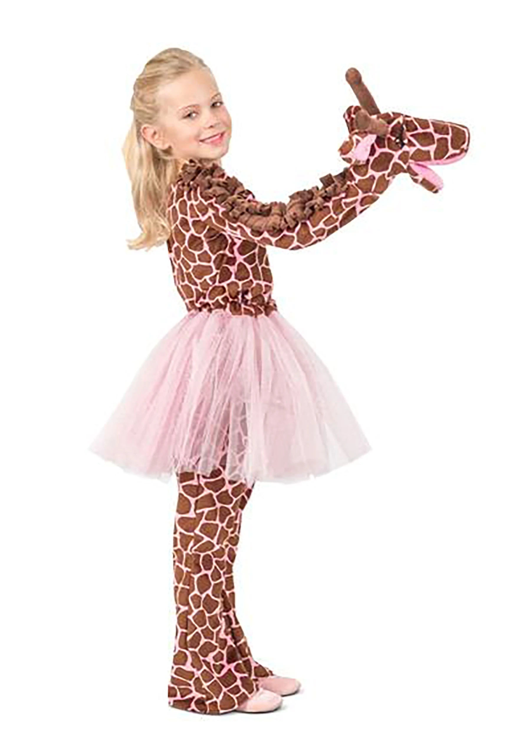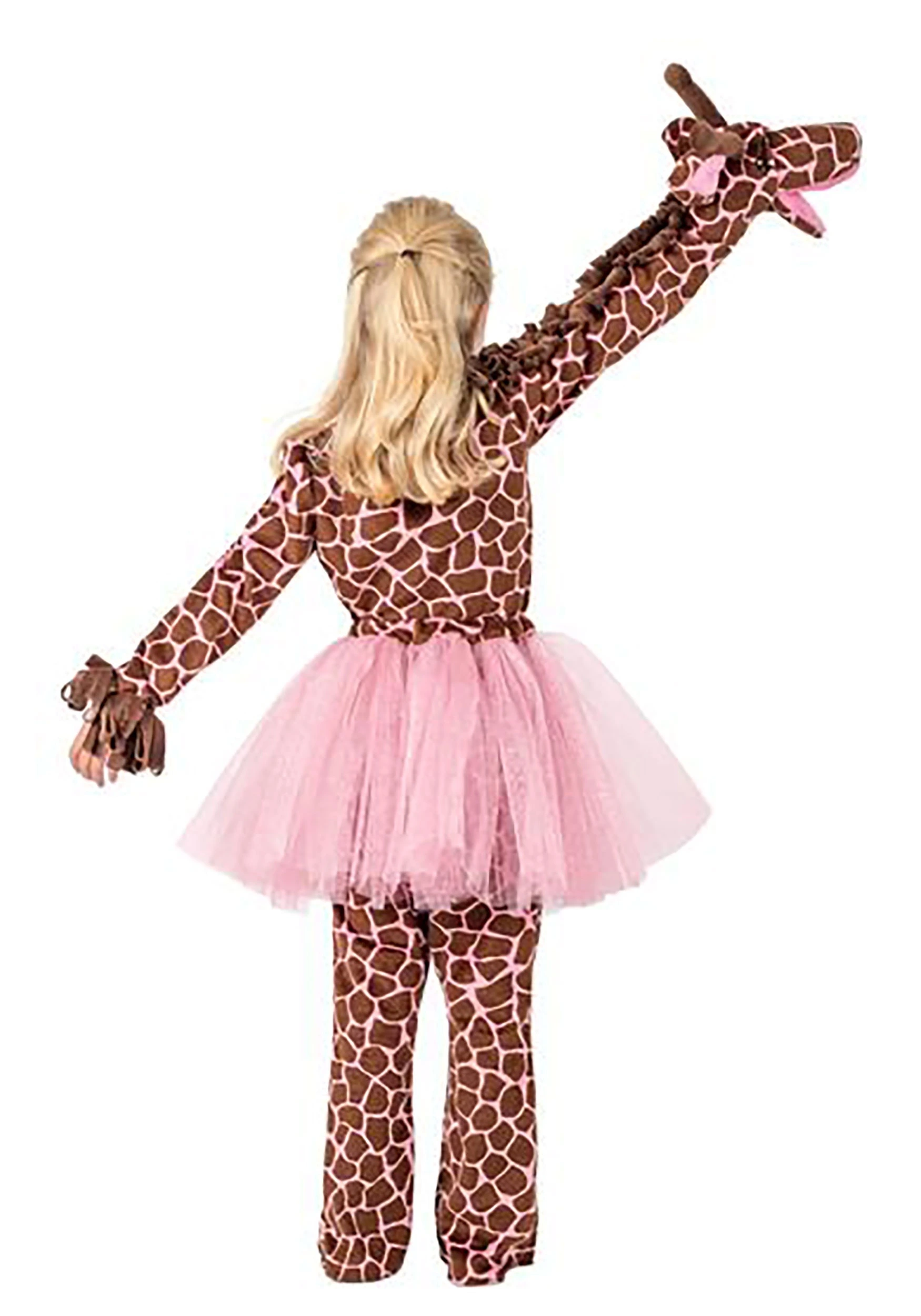A 3-piece costume that creates a fascinating look! The giraffe-print shirt features fringe on one sleeve cuff while the other sleeve doubles as a puppet contraception. Slip your arm through and control the “giraffe’s” movements. The matching pants are soft and stretchy like leggings and feature a comfortable elastic waistband. Finally, the included pink tutu is made from sparkling pink tulle to offset the rest of the costume while creating a whimsy, enchanted look. The tutu slips over the pants simply and easily, making the entire costume look like one complete piece.