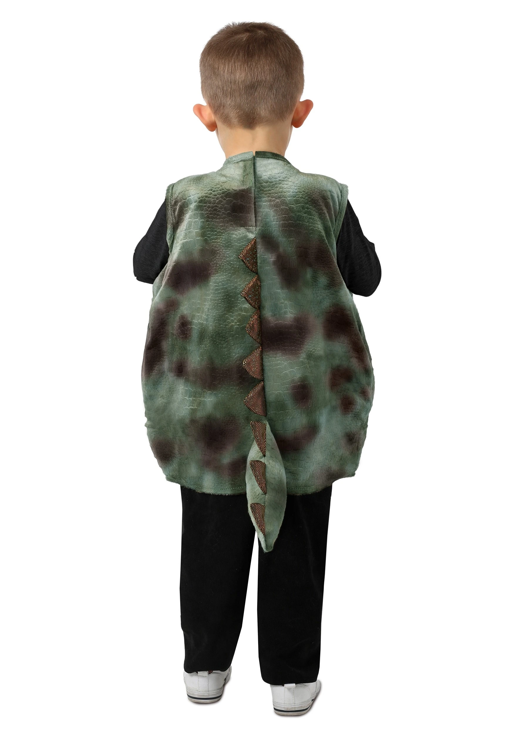 Expect roars of delight when your child wears this Kid’s Feed Me Dinosaur Costume! Ferociously frightening, yet amazingly awesome, this outfit is sure to bring smiles – and extra candy! The 100 percent polyester bodysuit has a hook and loop fastener on the back to keep the costume secure even when this prehistoric monster goes on a rampage. The brown, green, and grey-spotted dino face on the front is scary fun with its sinister smile. Beady eyes glare from either side of the head, always searching for more snacks. The open mouth ringed with giant teeth doubles as a pouch to store treats. The nose has a ridge of three shiny spikes. More spikes are sewn down the back of the bodysuit and continue onto the attached tail.