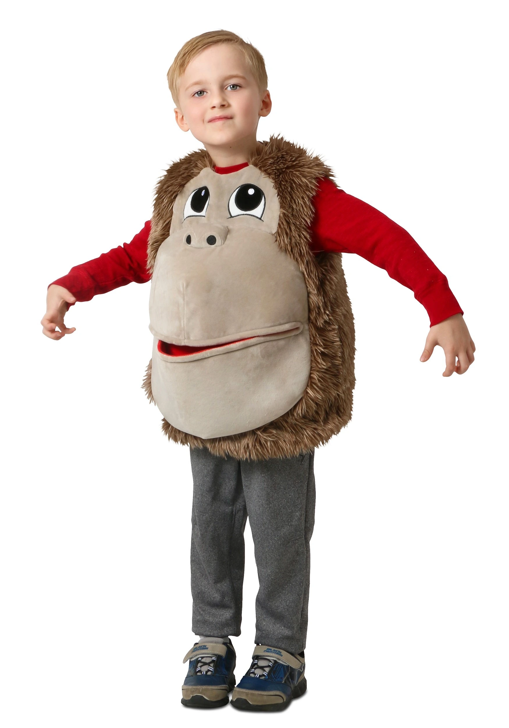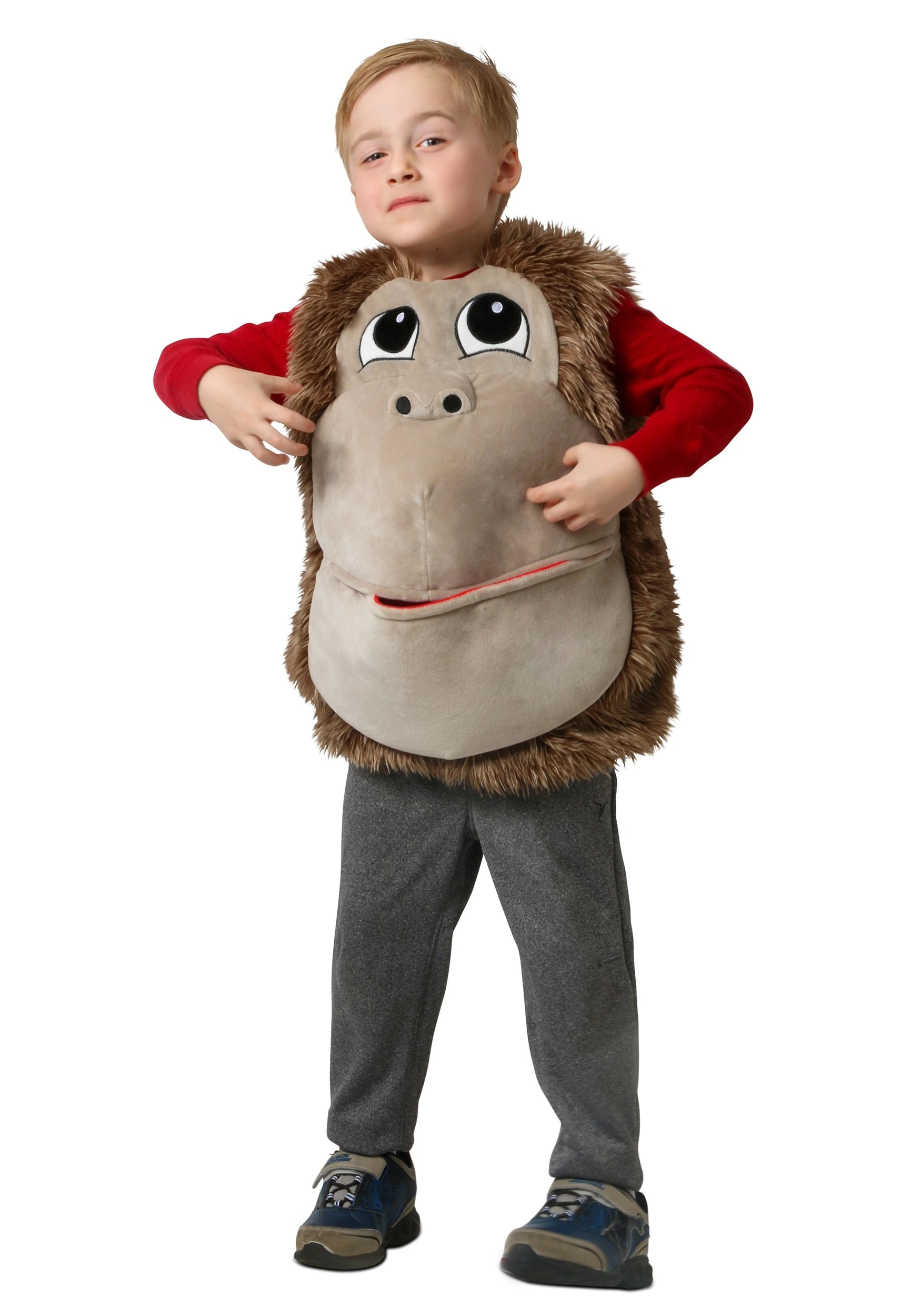 This Kid’s Feed Me Gorilla Costume is so much fun, it might make you pound on your chest with excitement! The 100 percent polyester pullover romper has plushy faux fur to simulate a gorilla’s thick pelt (or an awesome 1970s-style shag vest – you be the judge!) Big eyes begging for candy are embroidered on the front. No one will be able to resist giving you an extra scoop of jawbreakers! The gorilla mouth doubles as a big pocket to store treats and, yes, bananas!