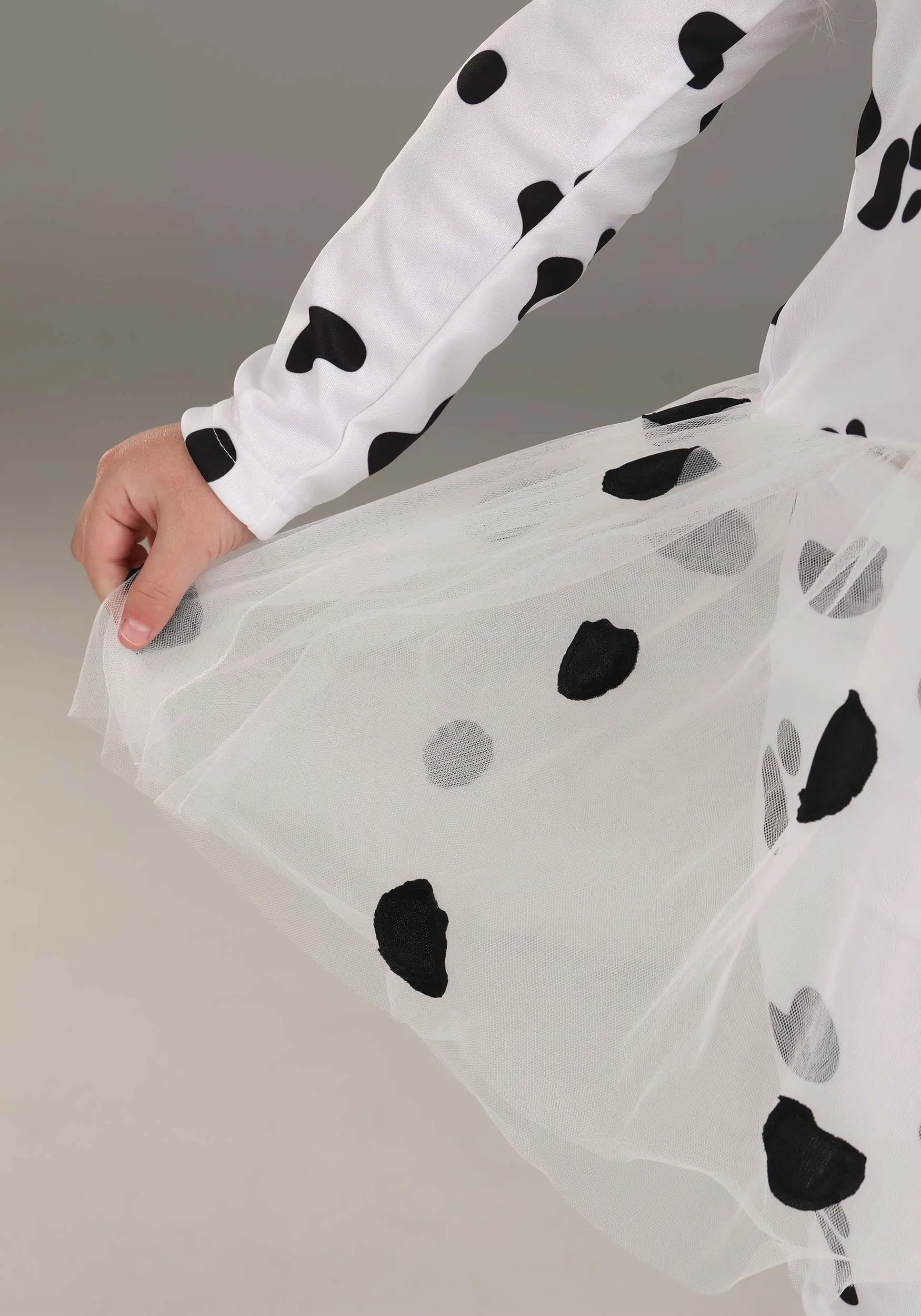 - Dress bodice & sleeves are jersey knit w/ printed spots, skirt is layers of netting w/ appliqued spots
