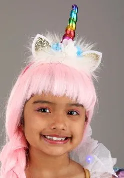 The magic is completed with a pair of shining wings and a unicorn headband. The wings attach with comfortable elastic bands that fit over the shoulders. The horn crowns the costume with flowers, sparkles, and even more magical lights!