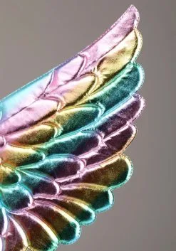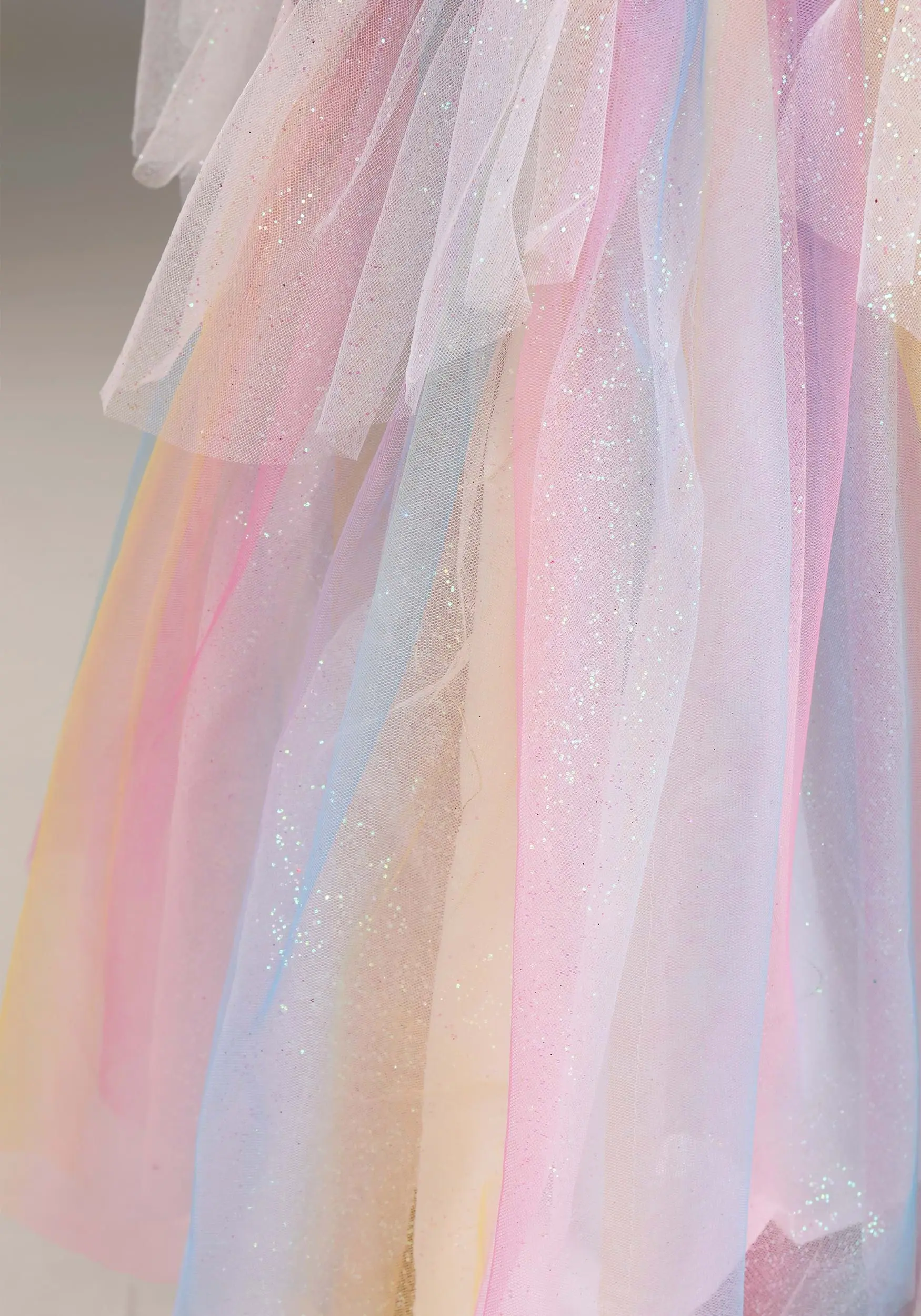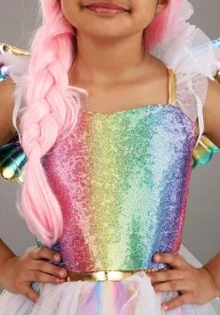 Our in-house design team knows a thing or two about bringing magic to life. This Made-By-Us Unicorn costume features a rainbow dress with next-level sparkle. The flared princess skirt has lights underneath the sparkly tulle while a ruffle down the back creates the tail of the unicorn. The bodice zips up the back. Both the front and the back are rich with rainbow sequins and offset with a ruffle along the golden straps, making it a fun dress to wear for dress-up with or without the wings.