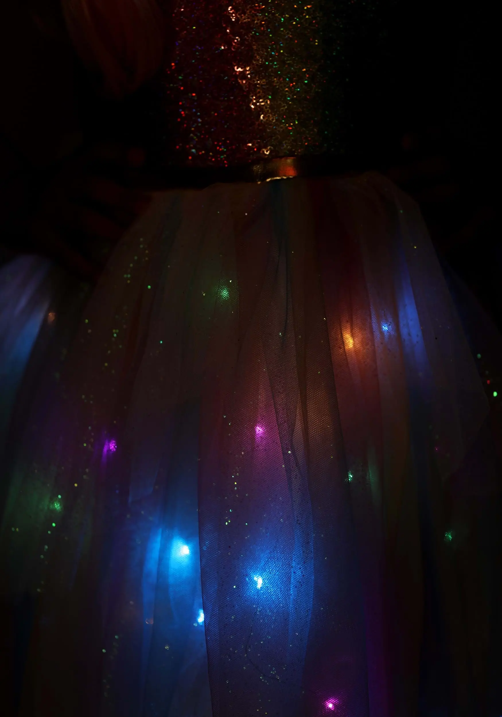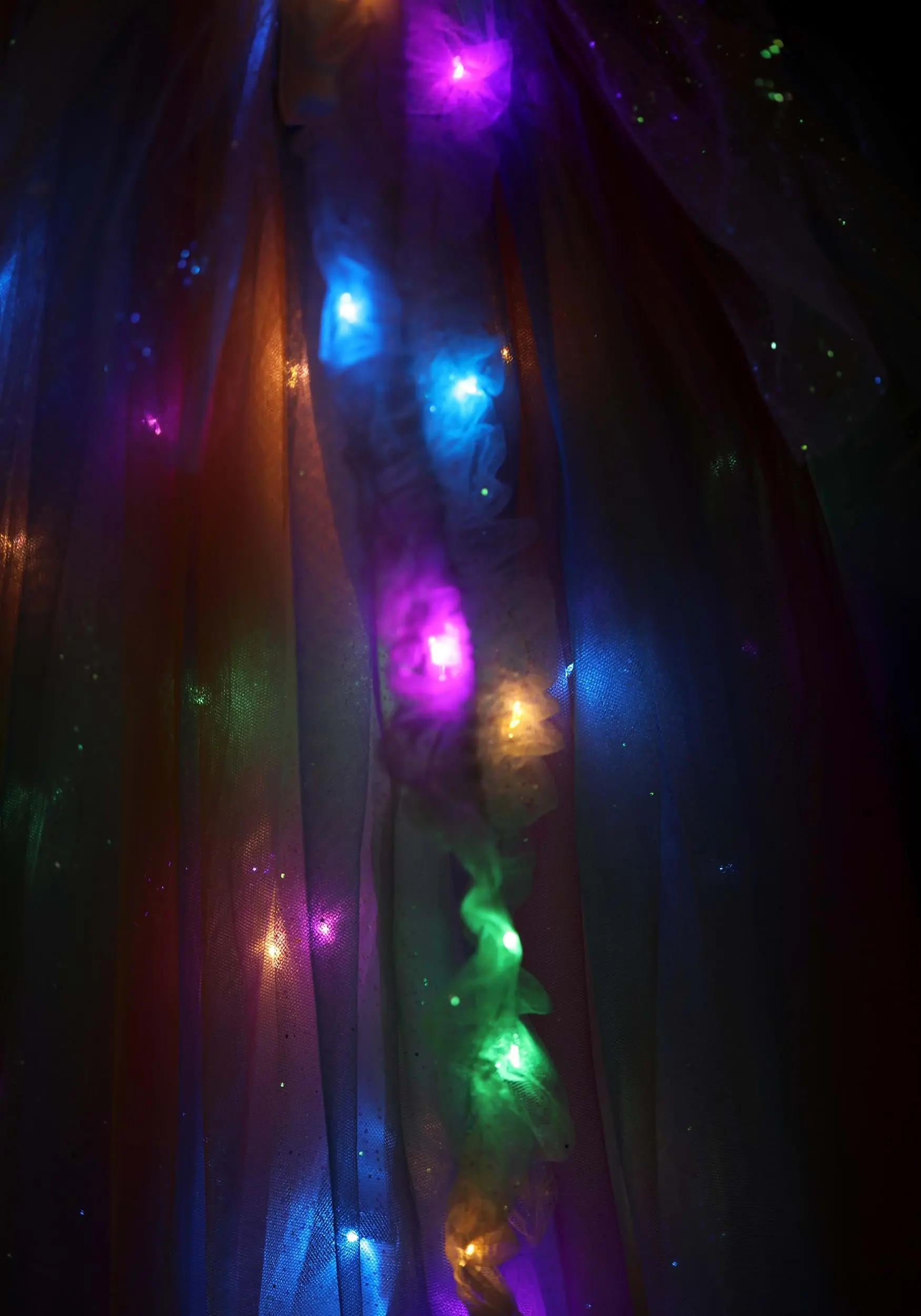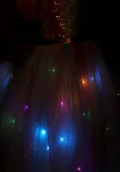 - Skirt lights up with multicolored LEDs between the tulle layers of the skirt
