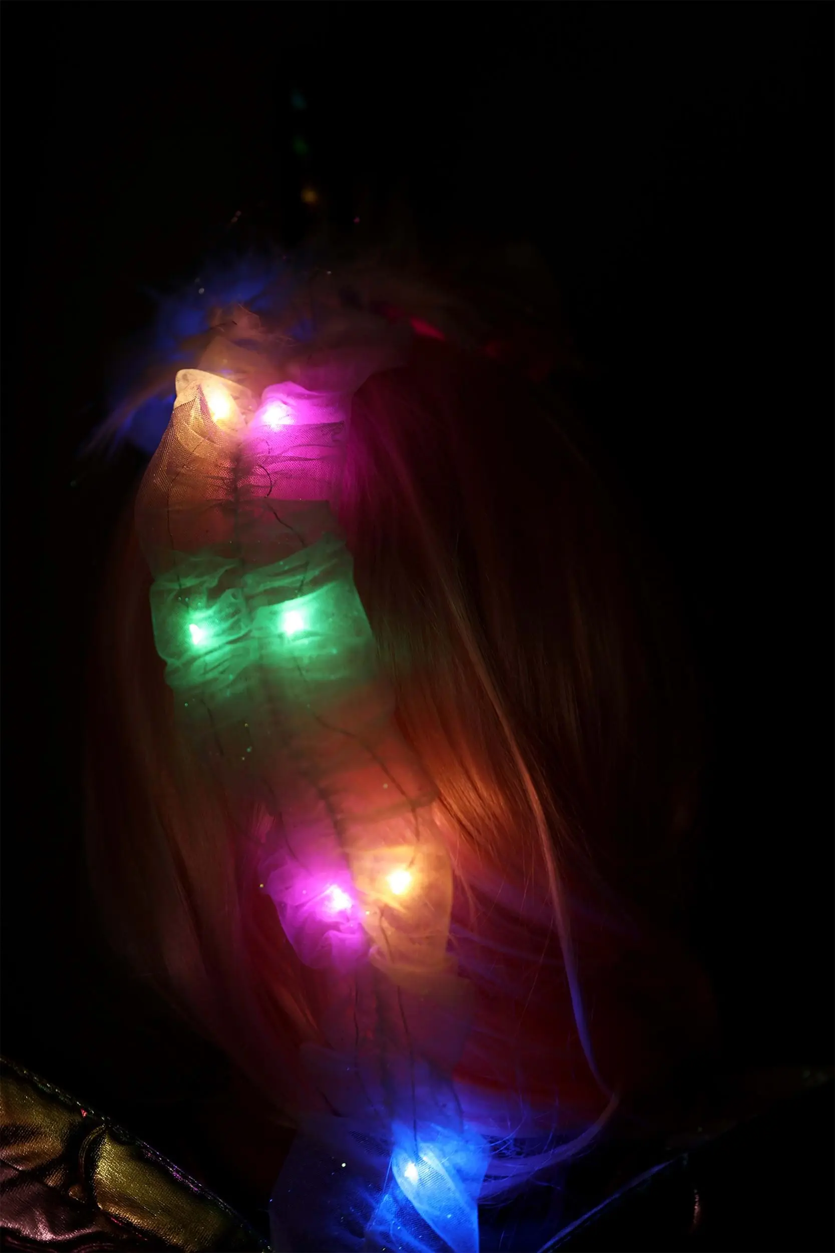 - Headband has same light modes and uses same batteries as dress (demo batteries included)