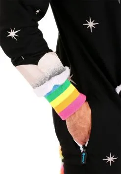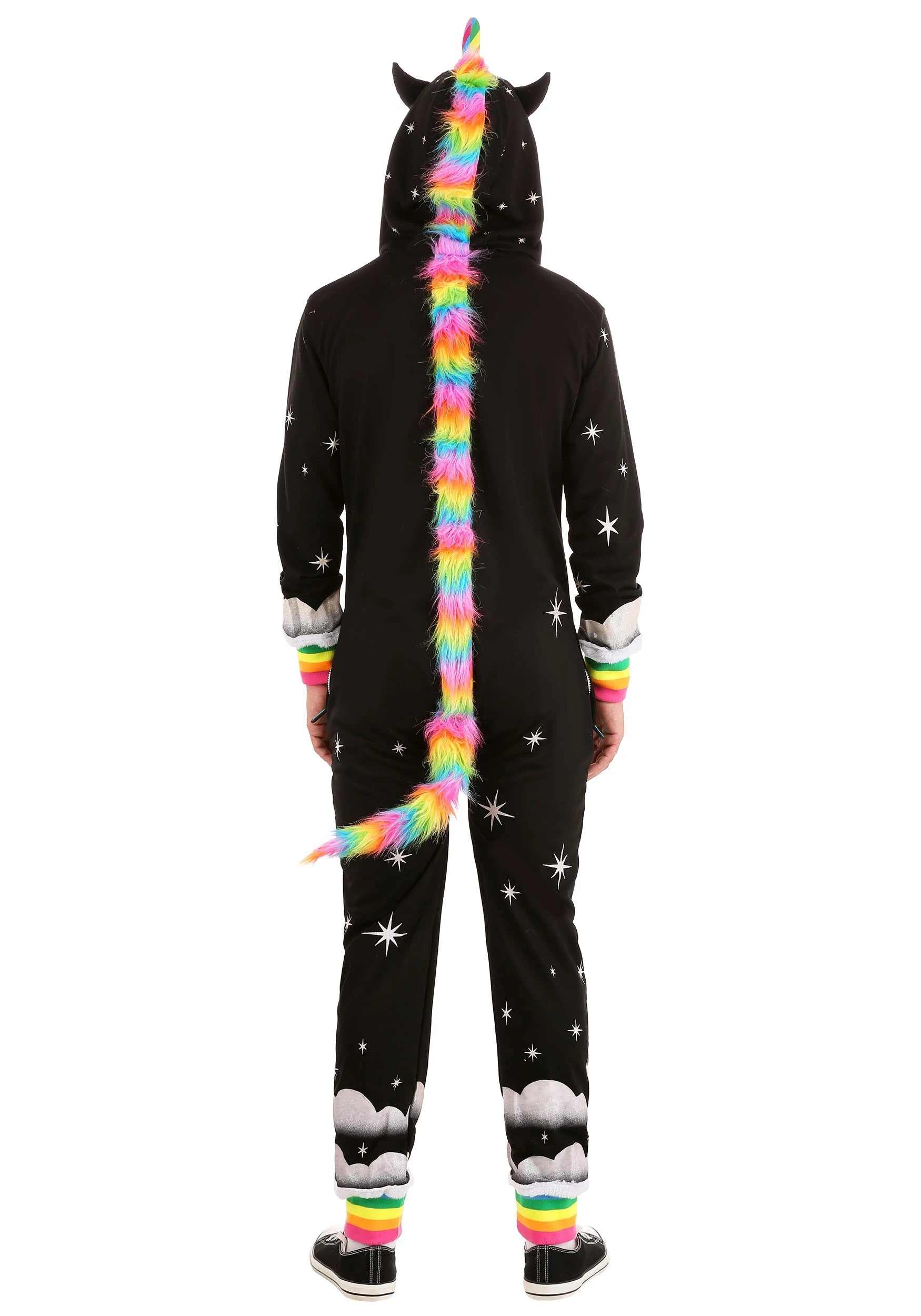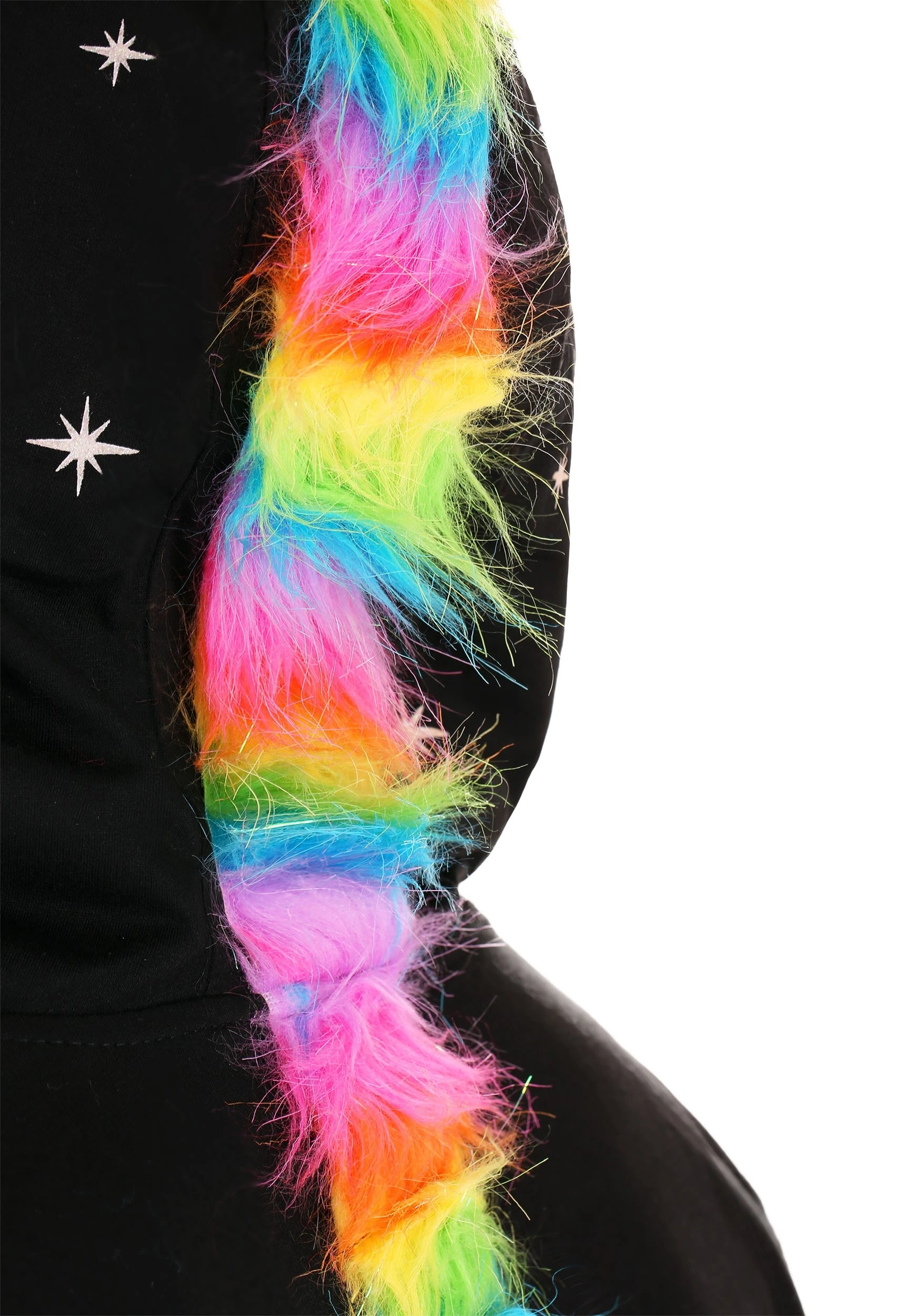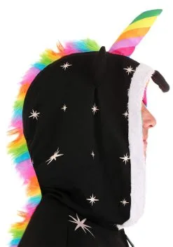 This fleece jumpsuit is a wonderful way to grant your wish for a cozy Halloween. Colorful and festive enough for a party and soft enough for a night of watching movies and giving candy to trick-or-treaters, this unicorn onesie can get plenty of use! The black star pattern is accented with rainbow cuffs at the wrists and ankles and a rainbow tail at the back. The lush hood is lined in a matching fabric and has a playful horn and mane that goes all the way down the back. The jumpsuit has small, functional pockets in the front and zippered pockets at the hip to keep your belongings secure, even while you’re gallivanting and granting wishes. Simply zip into this suit and you’ll be transformed for a magical Halloween!