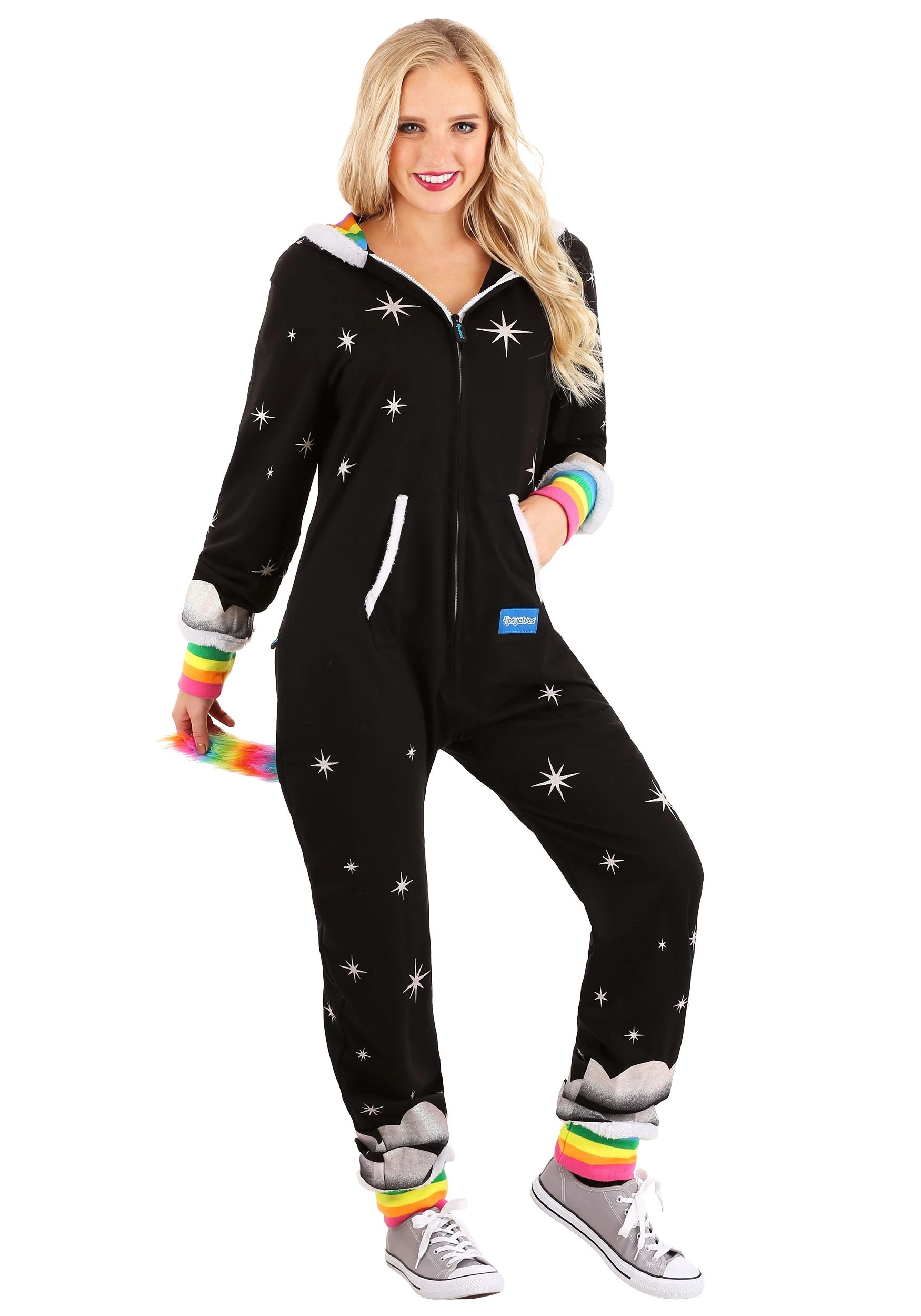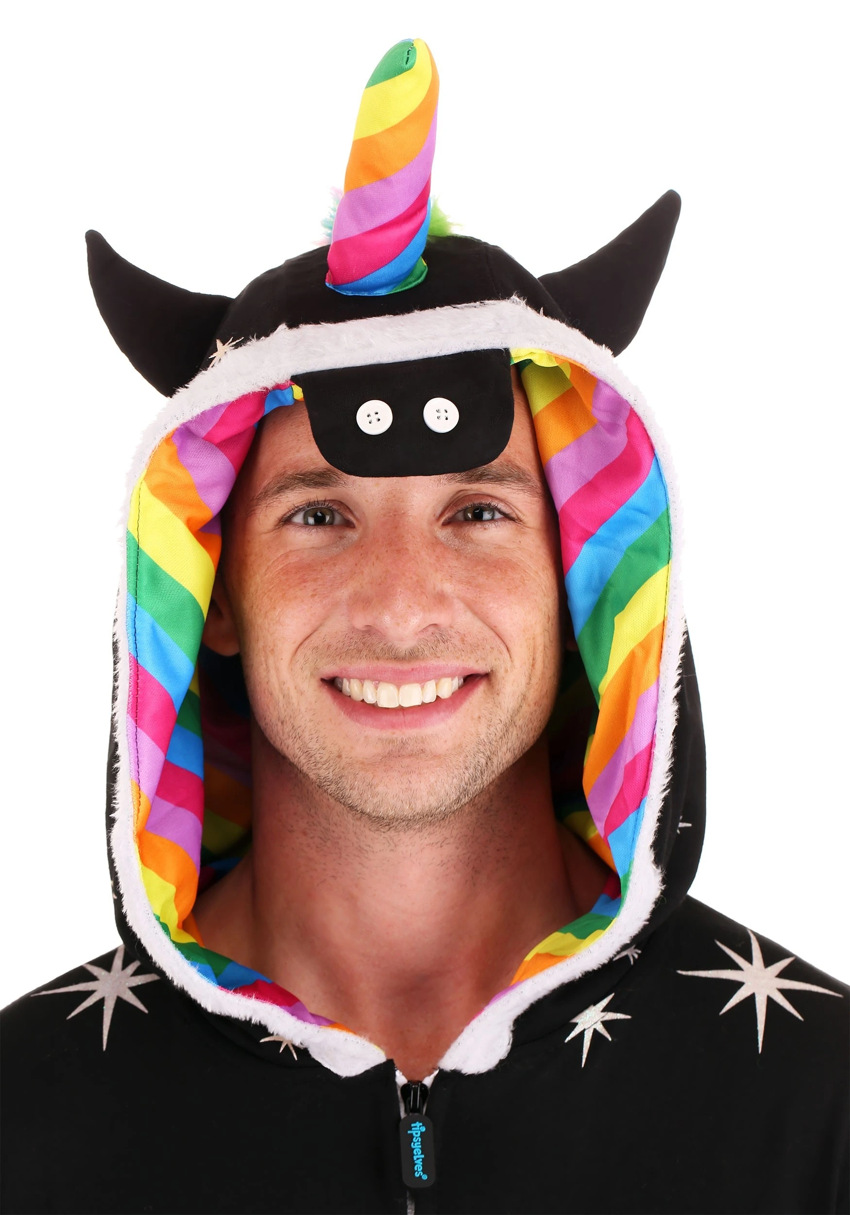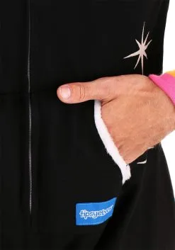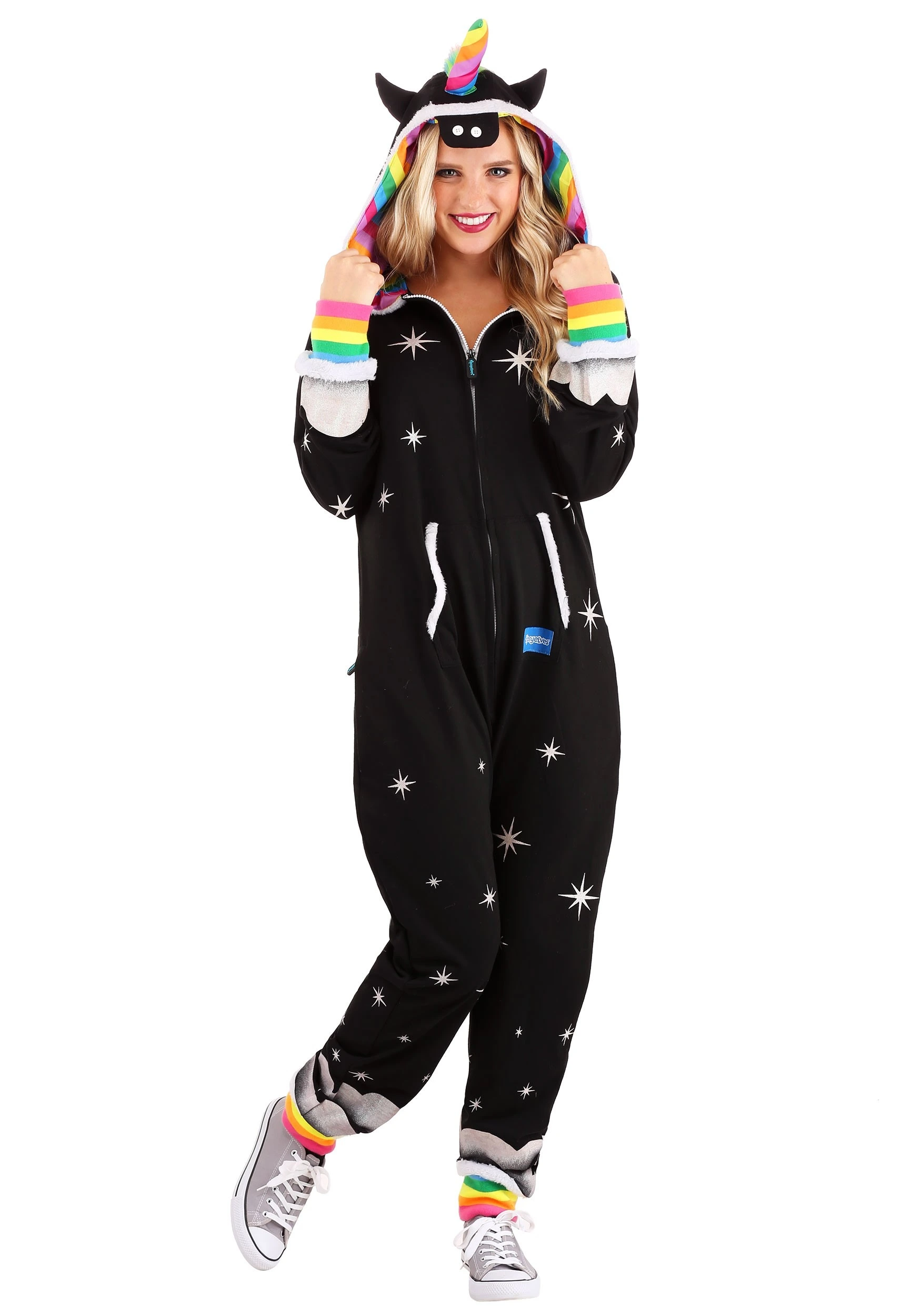 This fleece jumpsuit is a wonderful way to grant your wish for a cozy Halloween. Colorful and festive enough for a party and soft enough for a night of watching movies and giving candy to trick-or-treaters, this unicorn onesie can get plenty of use! The black star pattern is accented with rainbow cuffs at the wrists and ankles and a rainbow tail at the back. The lush hood is lined in a matching fabric and has a playful horn and mane that goes all the way down the back. The jumpsuit has small, functional pockets in the front and zippered pockets at the hip to keep your belongings secure, even while you’re gallivanting and granting wishes. Simply zip into this suit and you’ll be transformed for a magical Halloween!