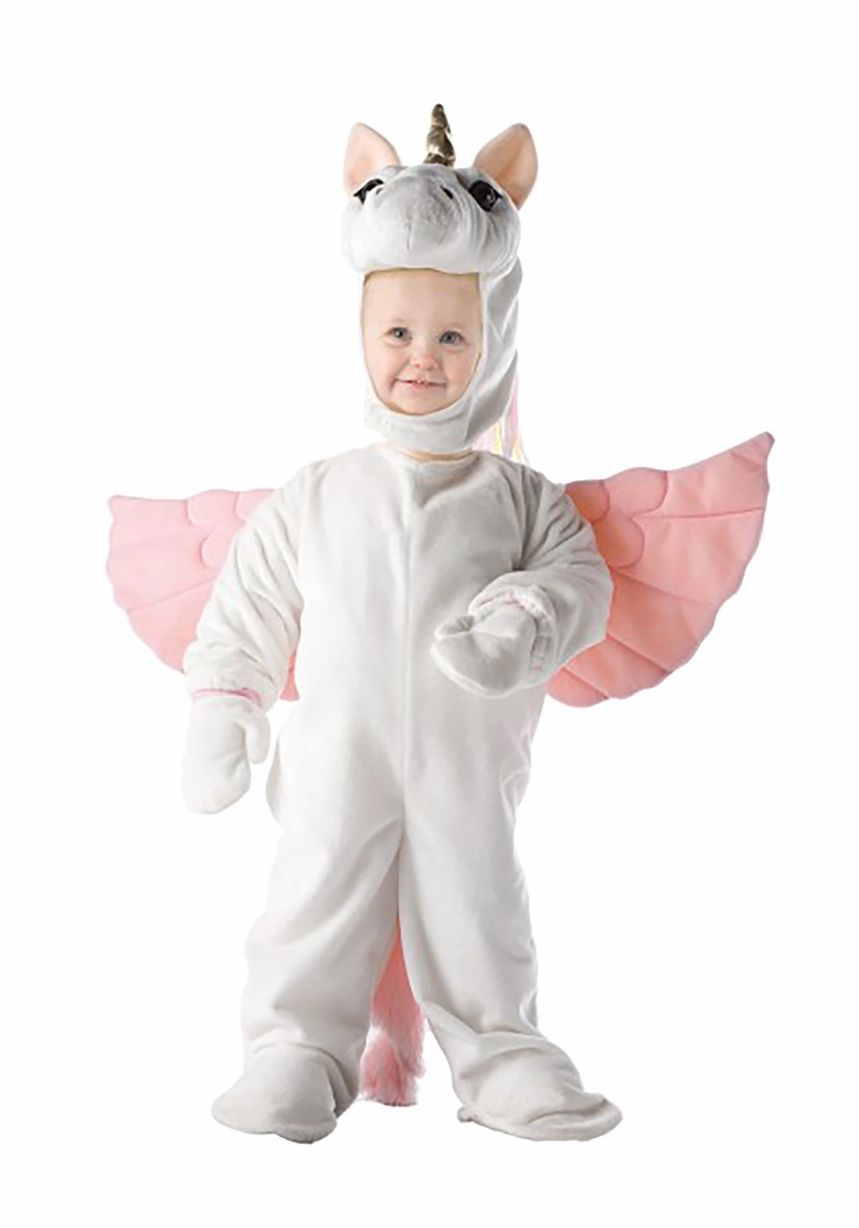 Transform your infant into the enchanting creature they’re meant to be with this Unicorn Infant Costume! The bright-white, velour jumpsuit gives them the shimmering coat of a unicorn while keeping them wrapped in warmth. A separate hood with a plush nose, soft-sculpted ears and horn, and attached facial features creates the recognizable image of a unicorn for your little one. A light pink tail and set of wings are sewn to the back of the jumpsuit completing this magical fairy look.